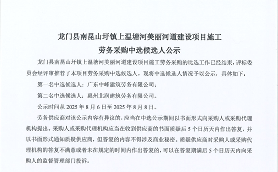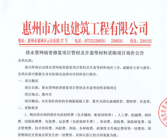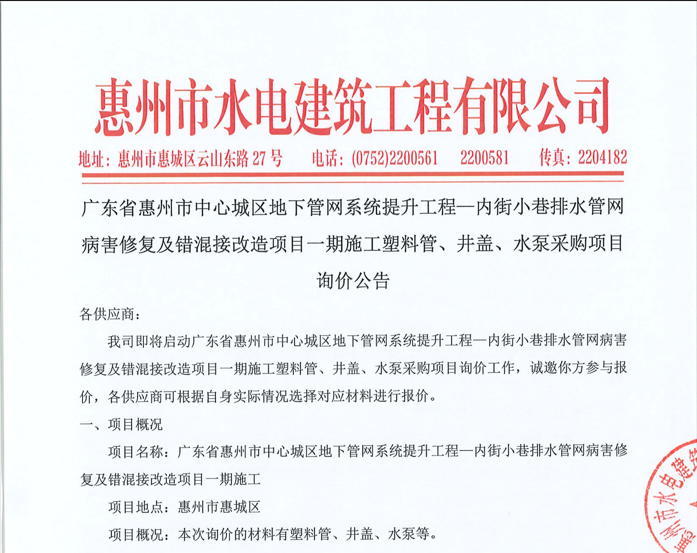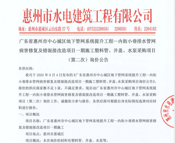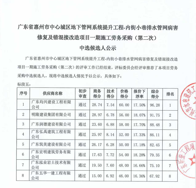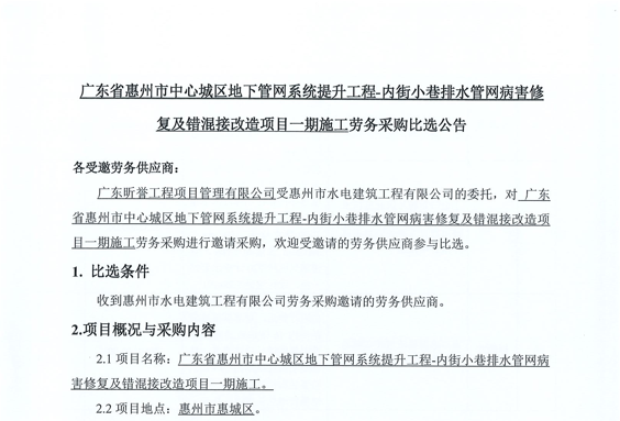 廣東省惠州市中心城區(qū)地下管網(wǎng)系統(tǒng)提升工程-內(nèi)街小巷排水管網(wǎng)病害修復及錯混接改造項目一期施工勞務采購(第二次)中選候選人公示……