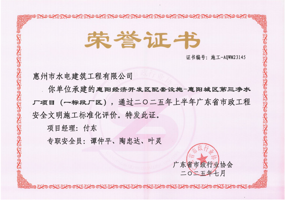 惠州市水電建筑工程有限公司成立于一九六四年四月,隸屬惠州市水務集團有限公司,是一家國有綜合性施工企業(yè),主營水利水電工程、房屋建筑、市政工程等施工業(yè)務。公司擁有水利水電工程施工總承包一級、建筑工程施工總承包一級、市政公用工程施工總承包一級、公路工程施工總承包三級,公路路基、路面及建筑裝修裝飾專業(yè)承包二級,環(huán)保工程、機電安裝、河湖整治、輸變電工程專業(yè)承包三級等經(jīng)營資質(zhì)……